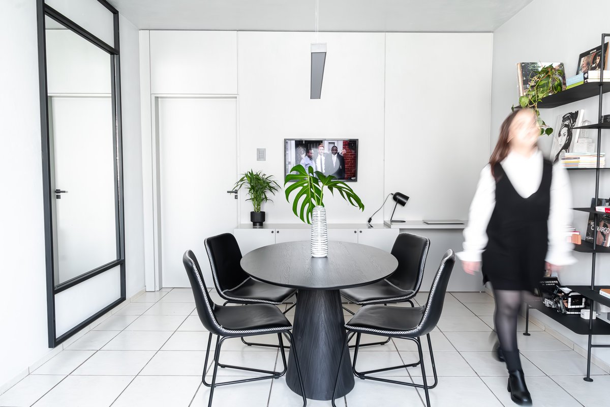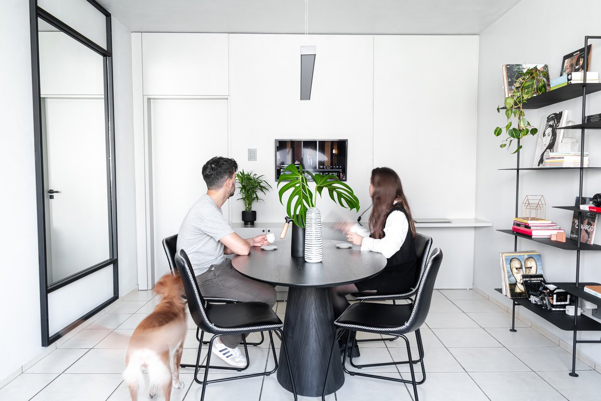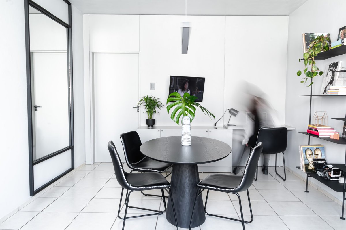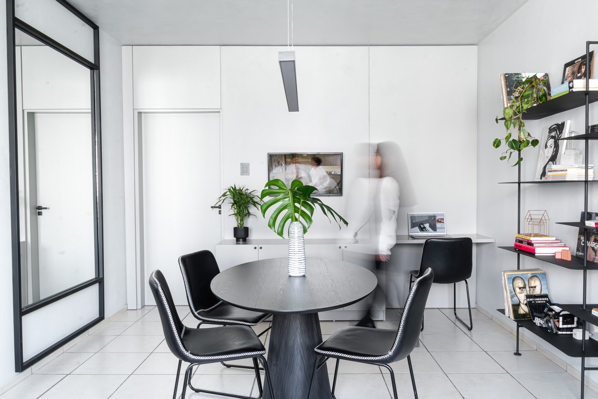 Transformei a sala de jantar do meu apartamento em um ambiente multifuncional, que atende às necessidades do morar contemporâneo e também do meu dia a dia profissional. Hoje, o espaço abriga meu escritório, onde recebo clientes, realizo reuniões de projeto, trabalho no modelo home office e, ao mesmo tempo, mantenho sua função original como sala de jantar.