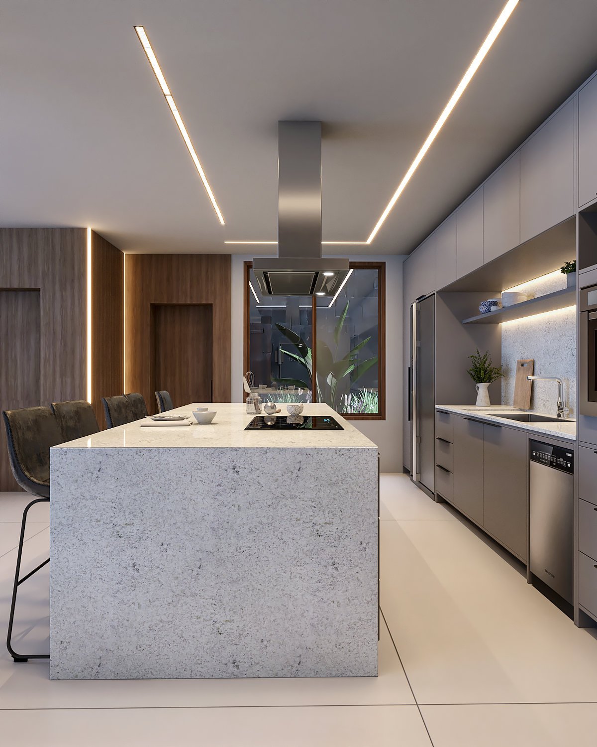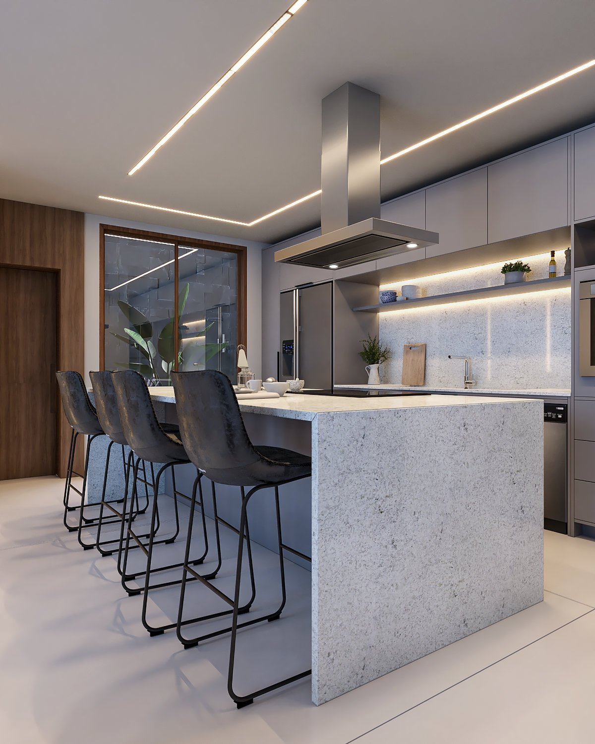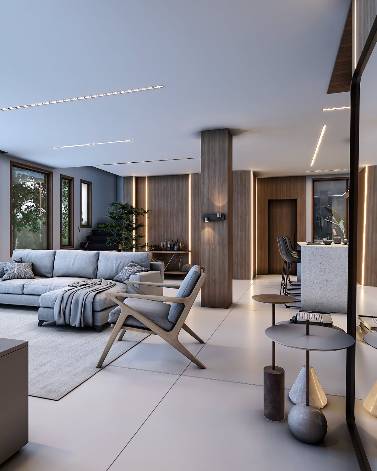 Interiores moderno e sofisticado, a aposta da materialidade foi em revestimentos e cores atemporais, como o cinza, a madeira e o cimento queimado.