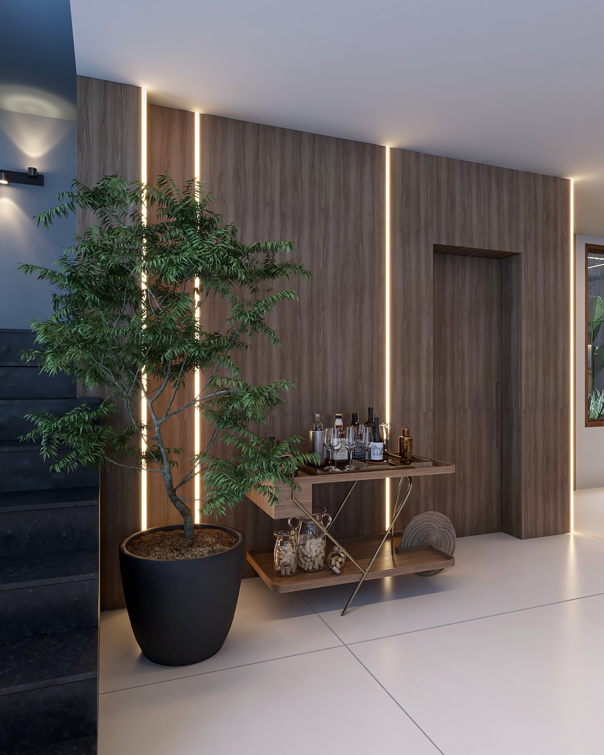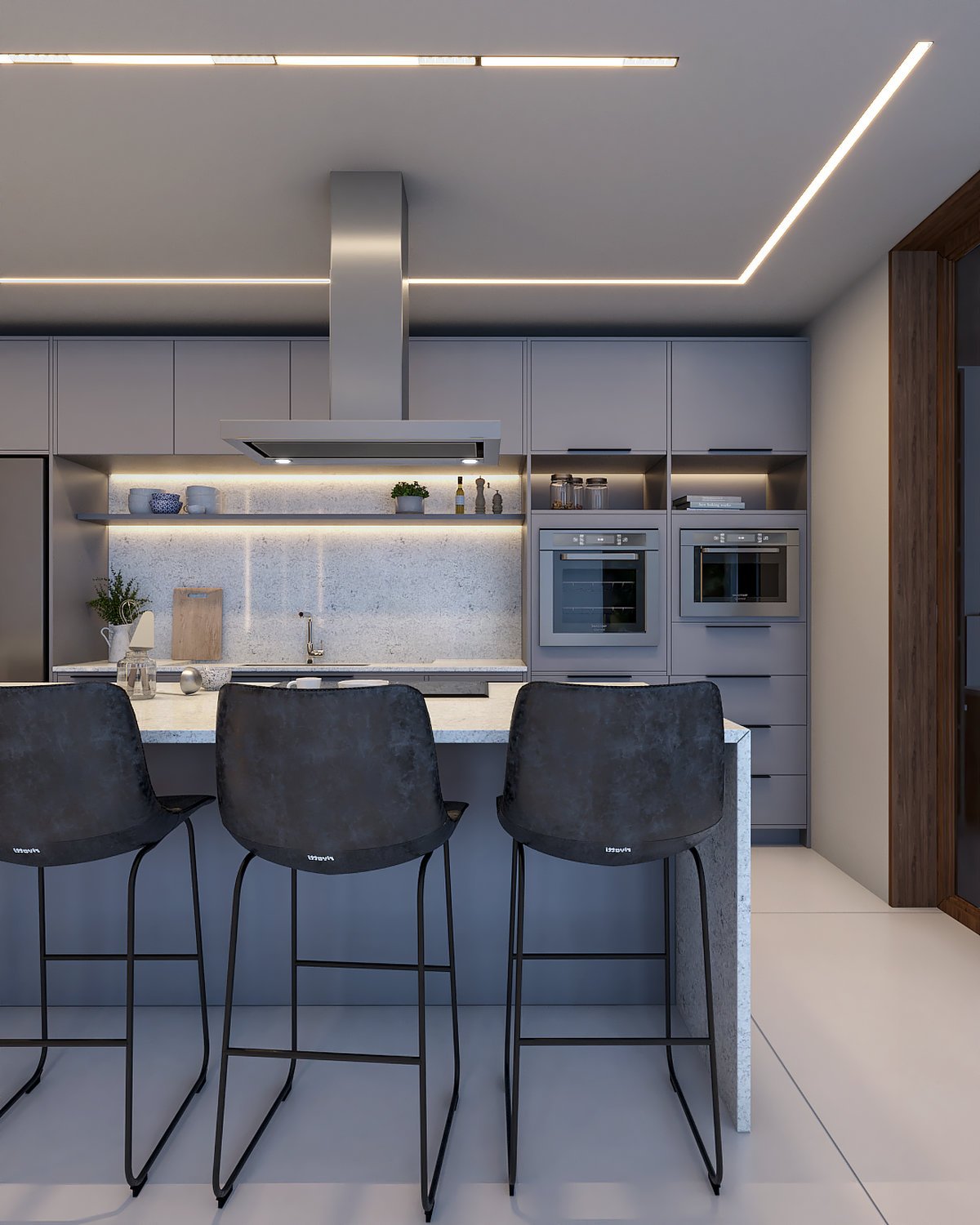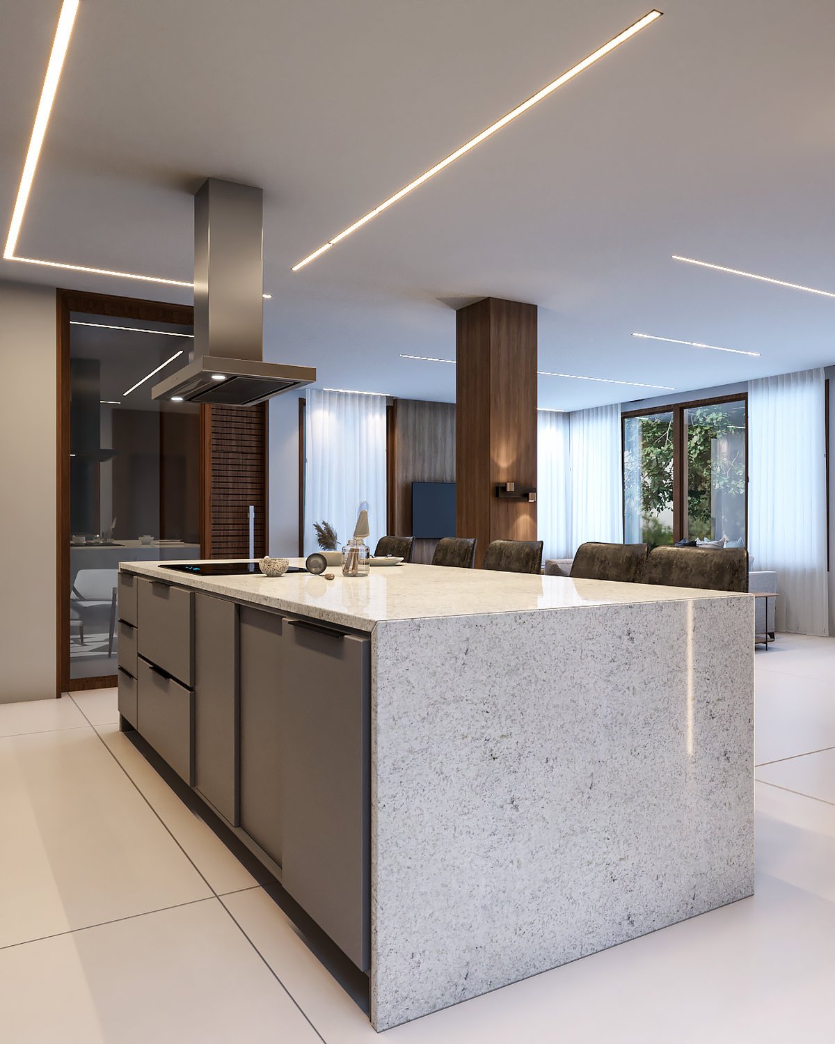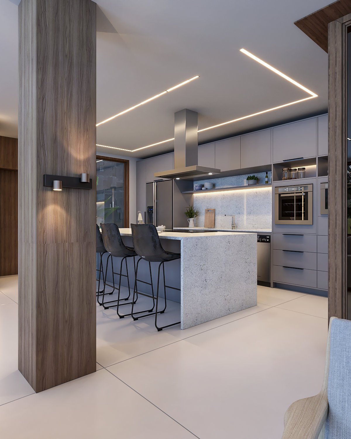 Interiores moderno e sofisticado, a aposta da materialidade foi em revestimentos e cores atemporais, como o cinza, a madeira e o cimento queimado.