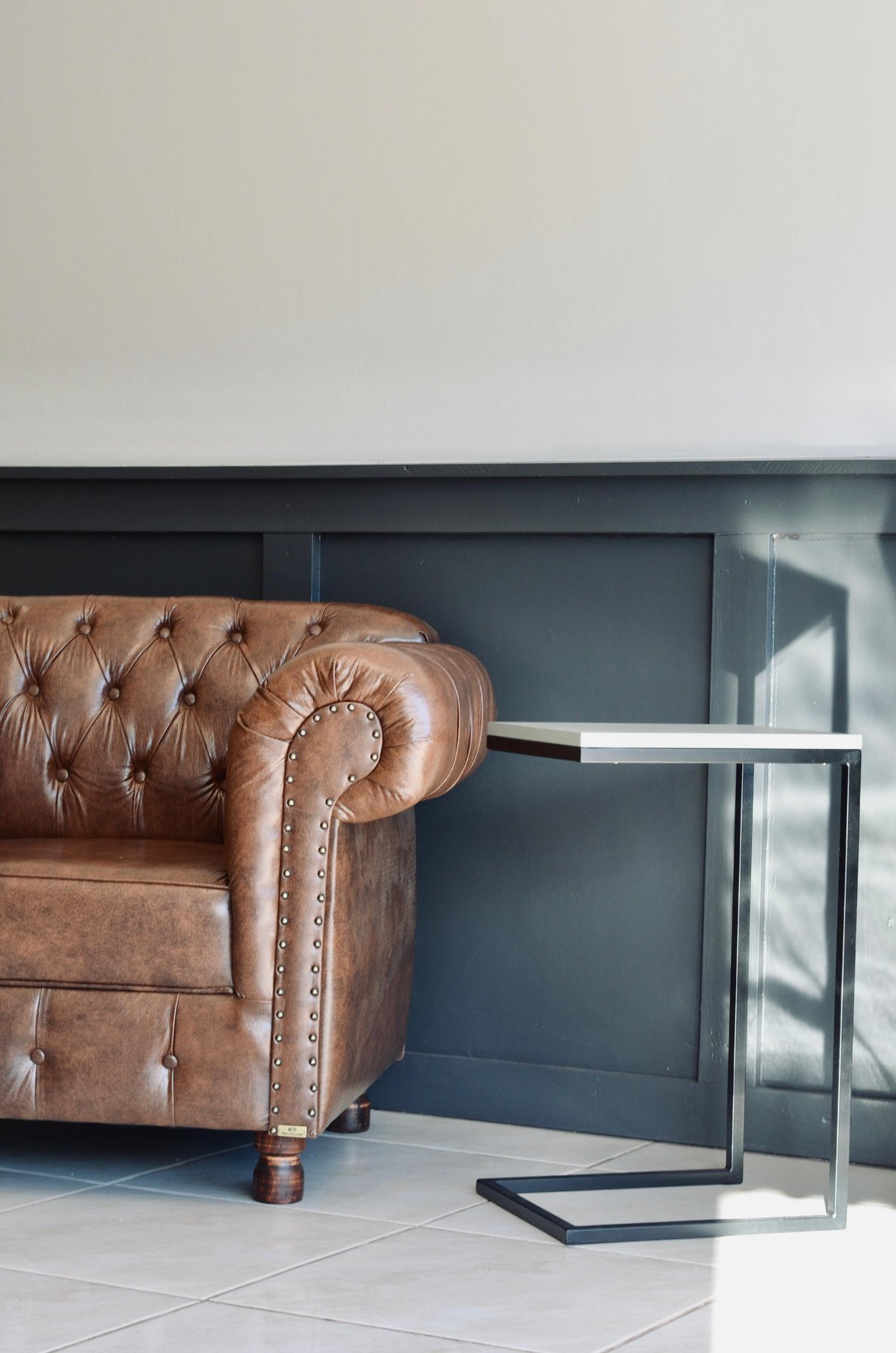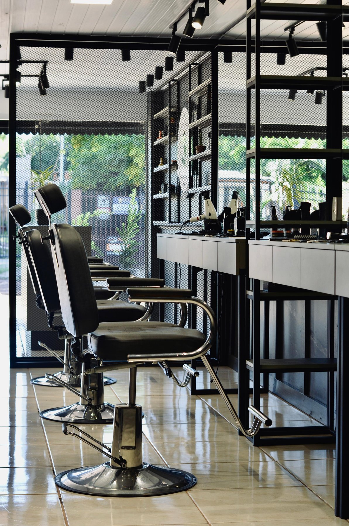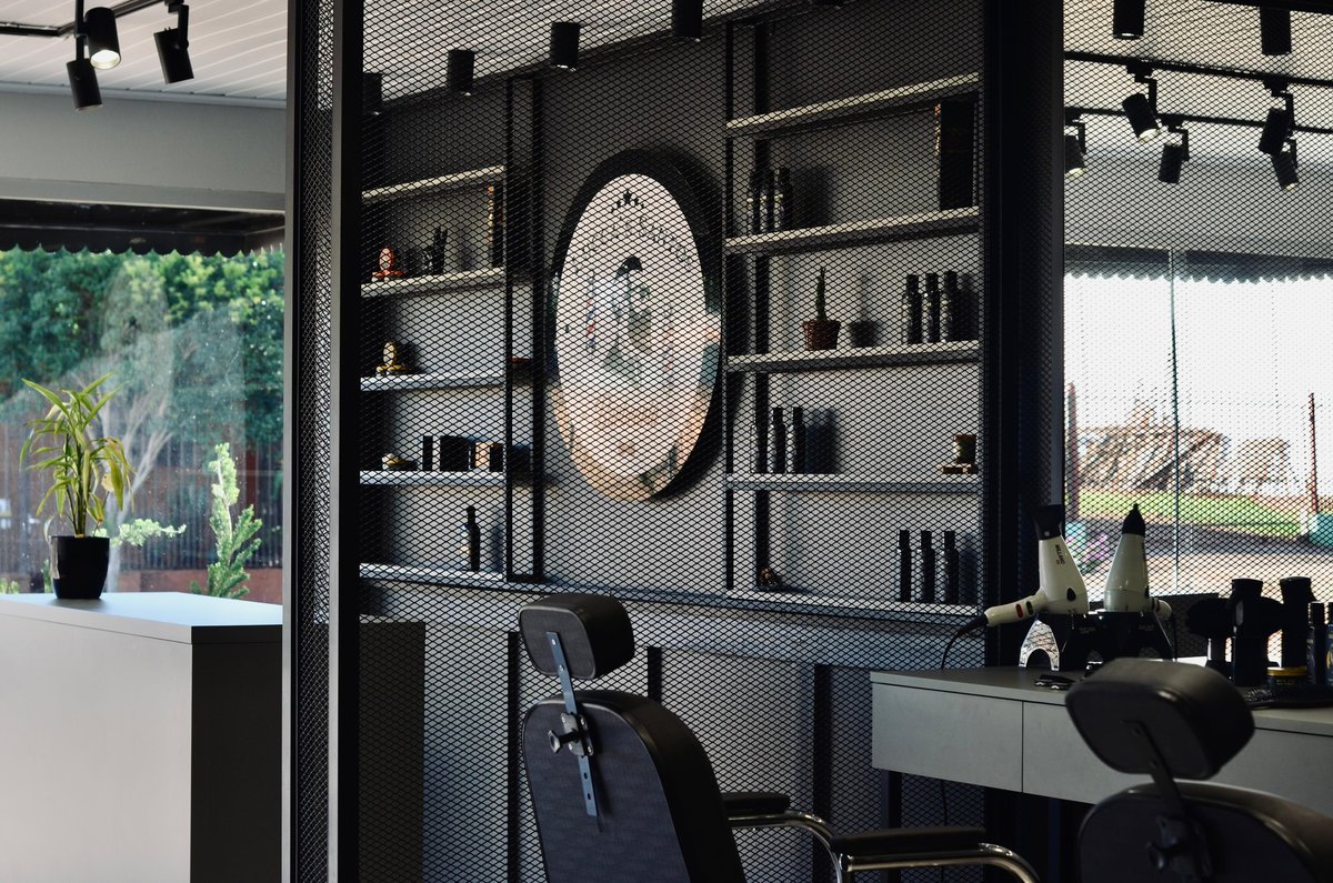 O estilo utilizado é a união de elementos vintage, como o lambri e as clássicas poltronas Chesterfield das antigas barbearias, com elementos modernos e industriais, como a serralheria. Foram utilizadas cores sóbrias, como o verde musgo e o cinza chumbo, que remetem ao universo masculino e ajudam a construir a identidade do ambiente.